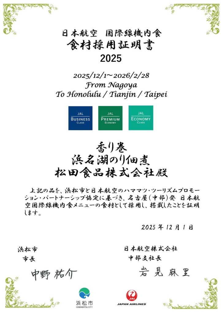 松田食品の代表製品「香り巻」と「浜名湖のり佃煮」が日本航空(以下JAL)の名古屋(中部)発 国際線機内食に採用され、提供されました!